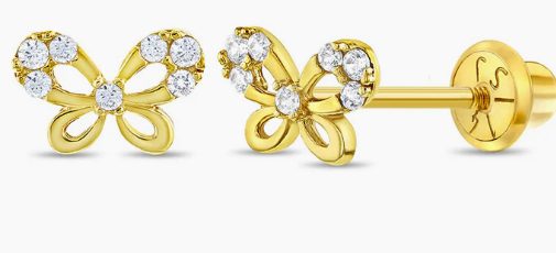 Your little girl will look sweet and pretty all day with these pair of 14k yellow gold butterfly screw back earrings. Its cute size will be suitable for your baby girl’s small pierced ears. These butterfly earrings for babies to toddlers have safety screw backs for an extra comfort and security. Buy this bright and sparkling butterfly jewelry to add a little pop of color to your little girl’s wardrobe. Gift box included.