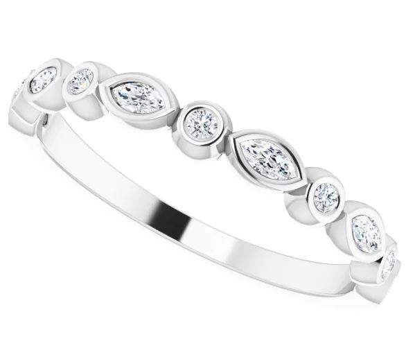 A unique and beautiful marquise and round diamond ring, Set in 14k white gold. What we love about this ring is the alternating marquise and round diamonds and the ability to mix, match and stack with other rings. Also it can be a perfect wedding ring to accent your engagement ring. Very versatile with endless options. Contact our team today with any questions or schedule a in store viewing with our expert team. We are here to assist you in finding a perfect jewelry piece to celebrate your special occasion.