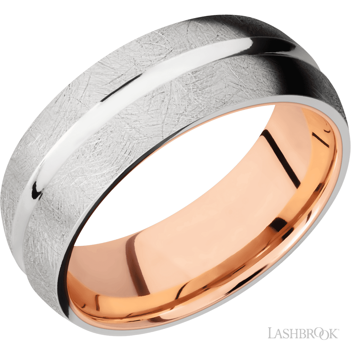 8 mm wide Domed Center Concave 14K White Gold band featuring a 14K Rose Gold sleeve.