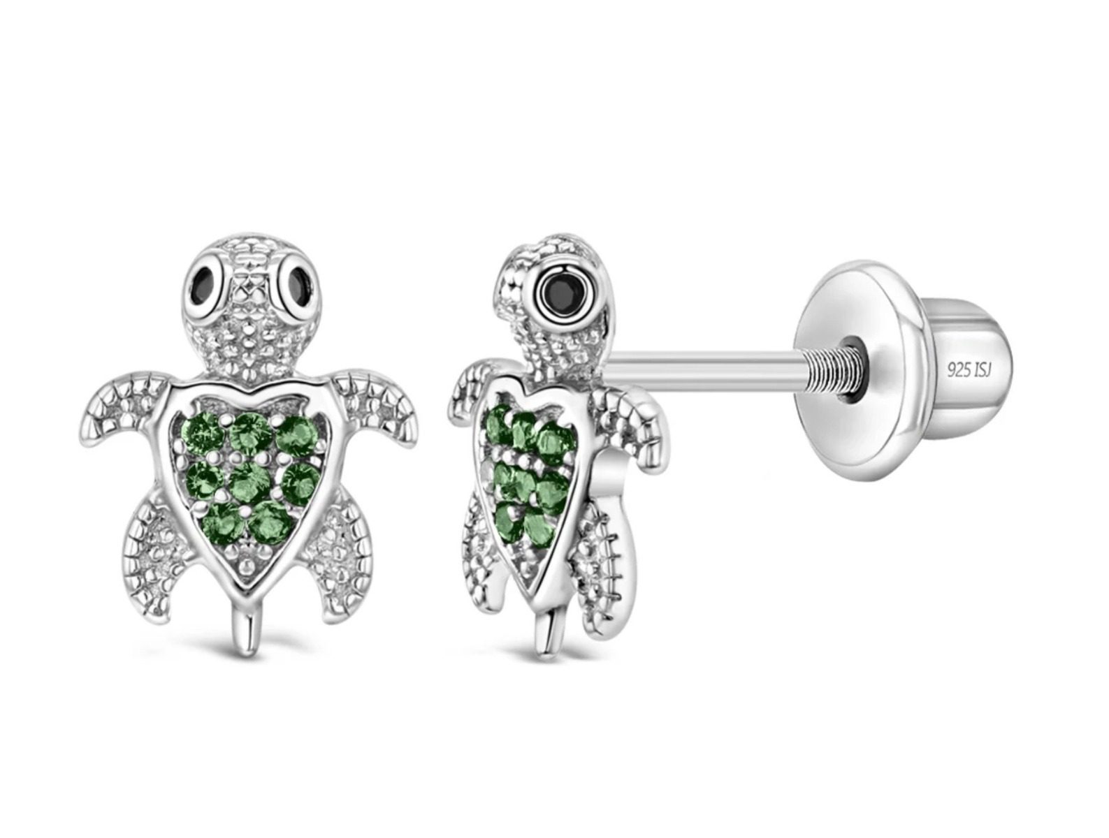 An In Season Jewelry favorite, these adorable little turtle earrings are sure to bring a smile to her face. Featuring beautiful round cubic zirconia stones and set entirely in 925 sterling silver, they are naturally hypoallergenic and safe for sensitive skin. They feature threaded posts and a safety back system to ensure your child’s earrings stay comfortably in place. These turtle earrings make a perfect gift for any occasion or just for a fun day at the beach. Beautiful gift box included for easy giving!