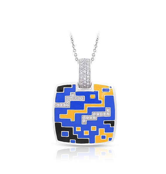 Blue & Yellow: Hand-painted blue and yellow Italian enamel with pav??-set stones set into rhodium-plated, nickel allergy-free, 925 sterling silver.