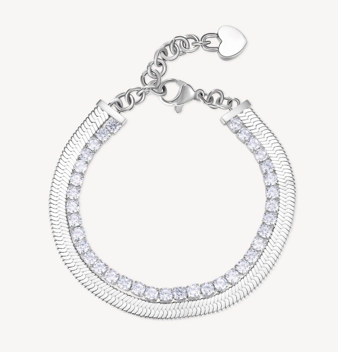 304 stainless steel flat snake chain bracelet and clear cubic zirconia.