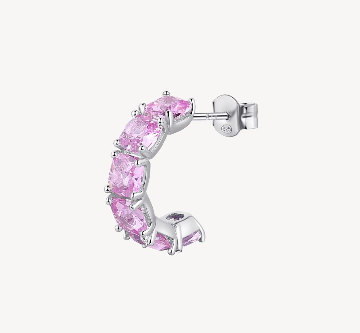 925‰ rhodium-plated sterling silver single circle earring with light ruby color cushion cubic zirconia.