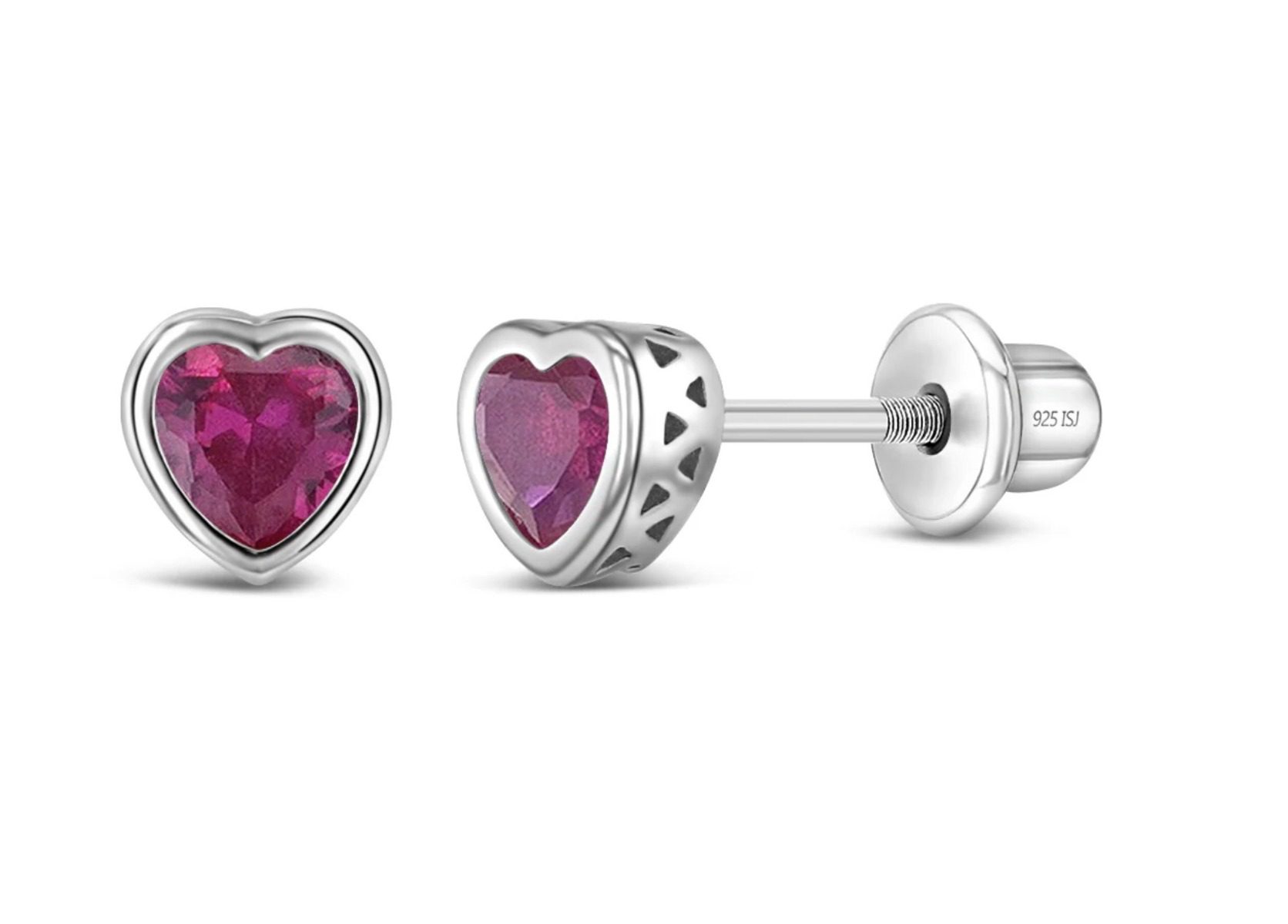 CZ Birthstone Heart Baby / Toddler / Kids Earrings Screw Back Basket Setting – Sterling Silver