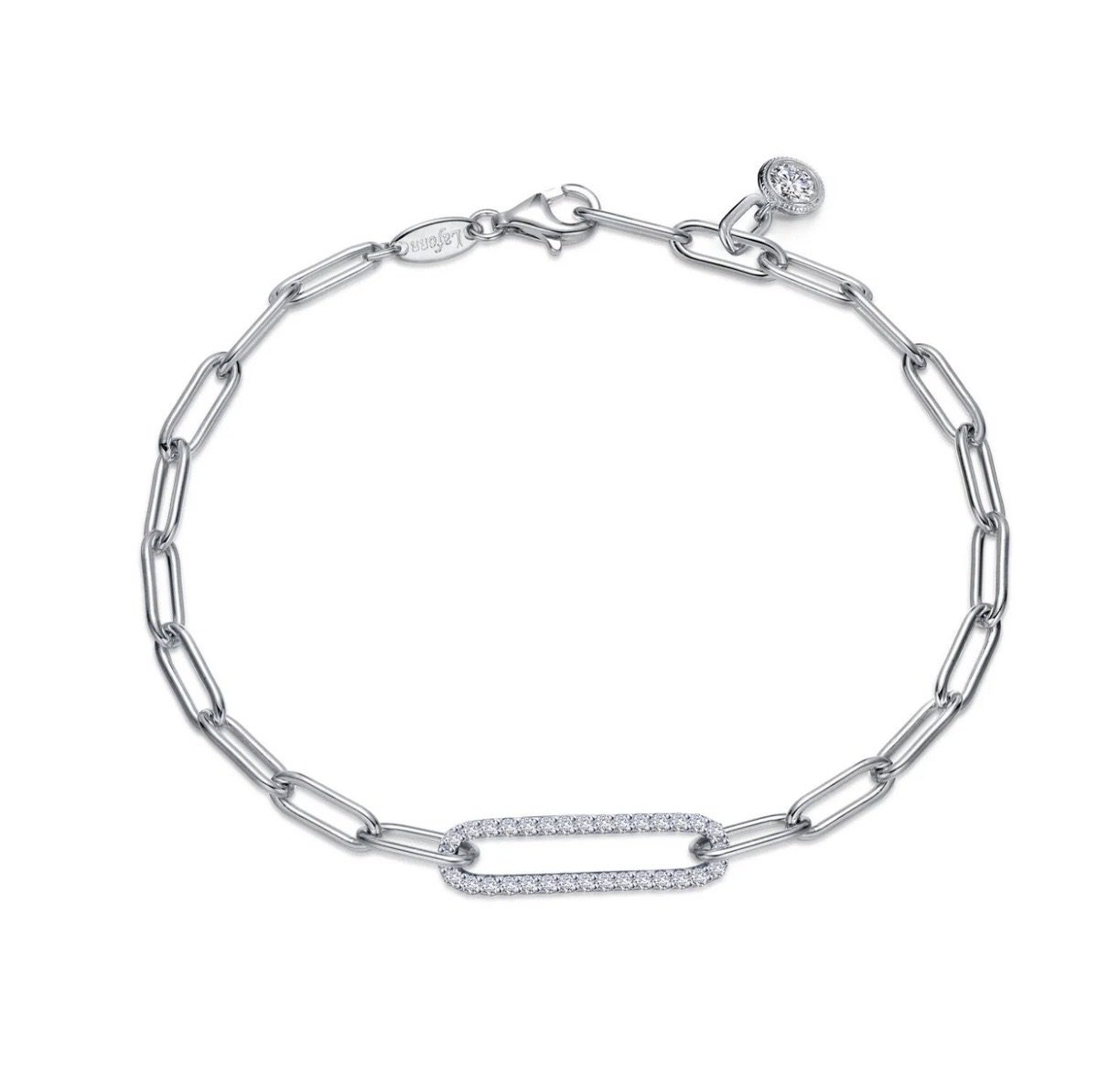 Stylish and attractive. This elegant paperclip bracelet is in sterling silver bonded with platinum, with the center link set with Lafonn’s signature Lassaire simulated diamonds .
